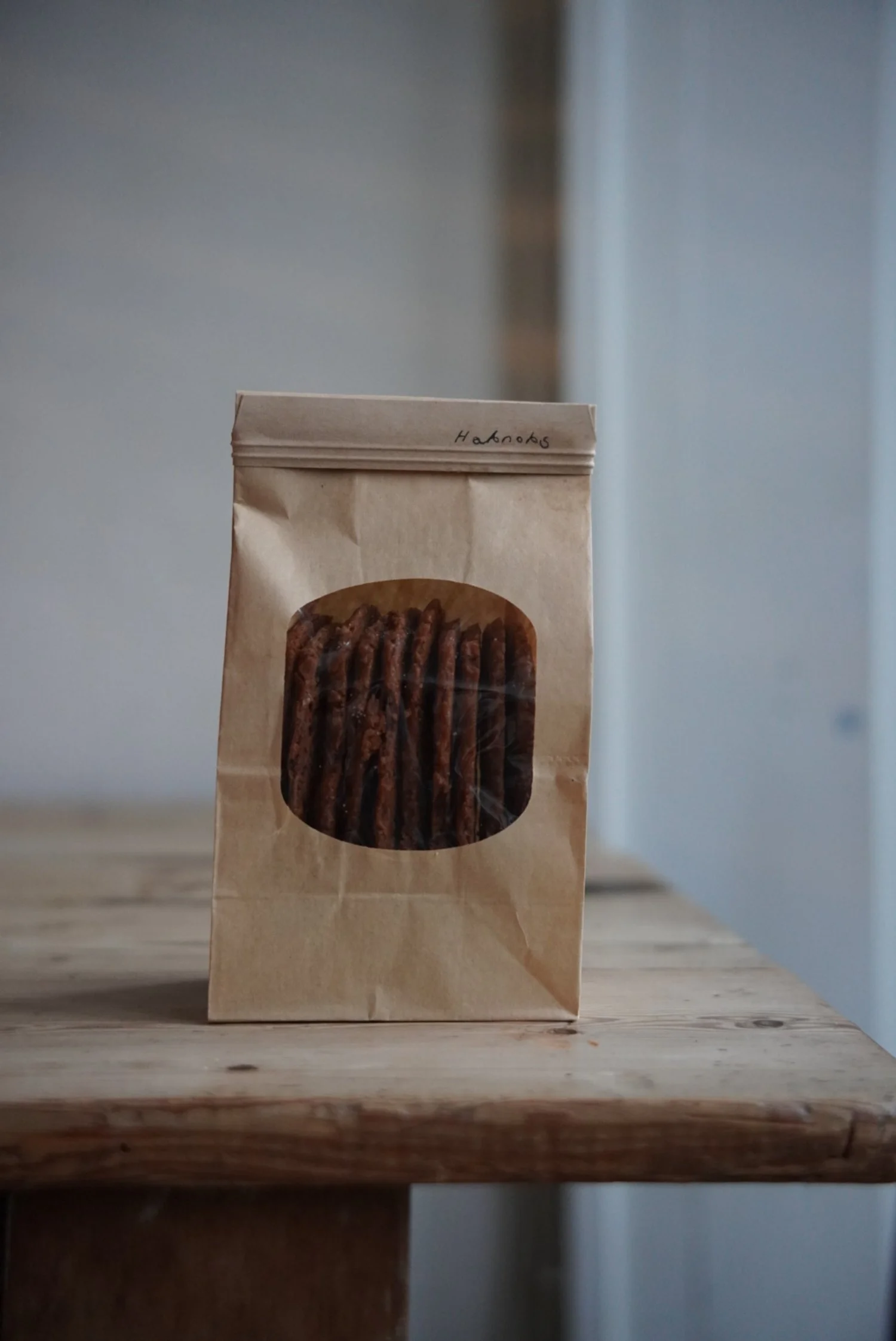 Delicious hobnob biscuits made with almonds, cultured butter, honey, muscovado sugar, salt and heritage flour. 150g bag